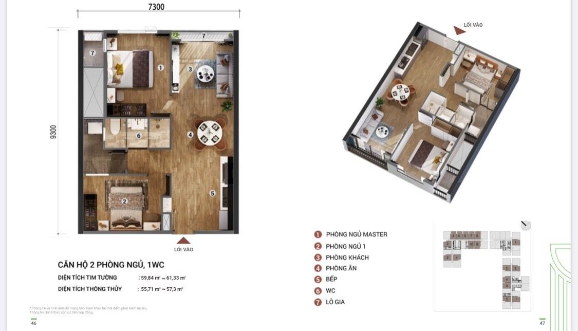 - chung cư 2 phòng ngủ - 1 toilet (61 mét vuông).