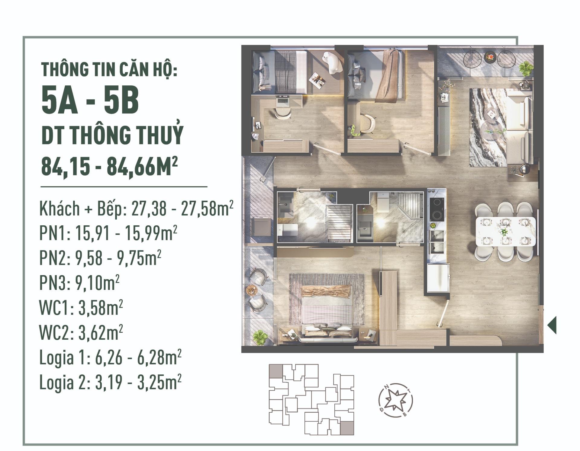 DT: 84,5m² (Bố trí 3 phòng ngủ tối ưu công năng).
