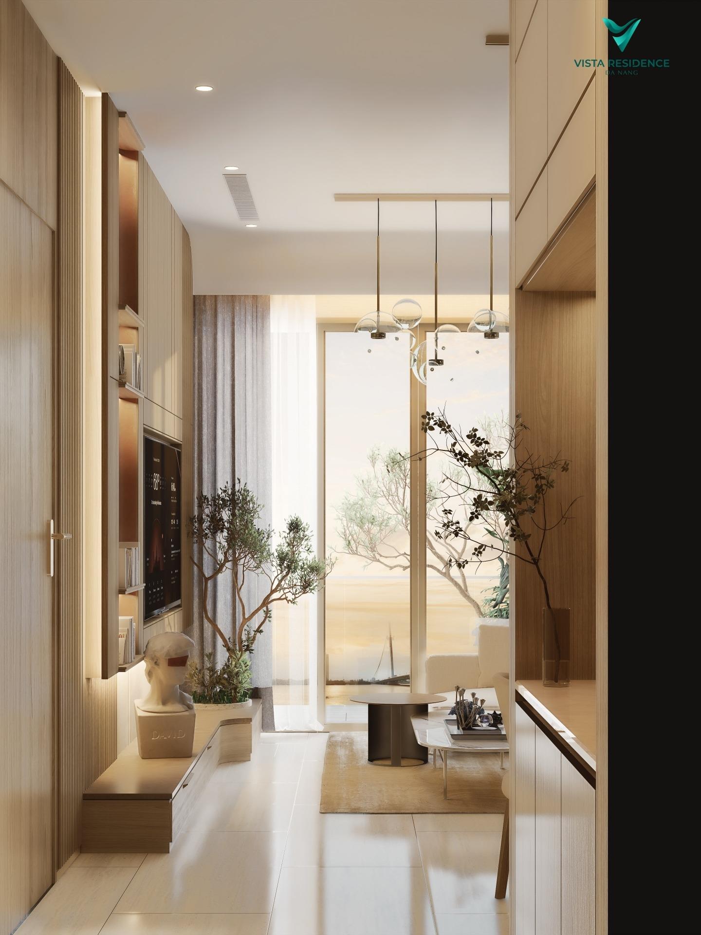 Không gian bên trong đc thiết kế tinh tế, tối ưu ánh sáng và thông gió tự nhiên. Phòng khách hướng ra logia lớn – nơi mỗi buổi tối, bạn có thể ngắm nhìn sông Hàn lung linh và TP lên đèn.