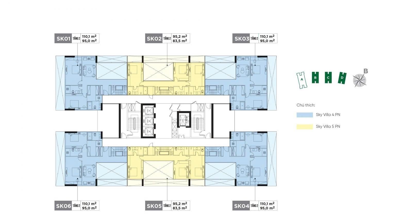 - Tầng 2: 95m2 (3 phòng ngủ + 2 nhà vệ sinh).