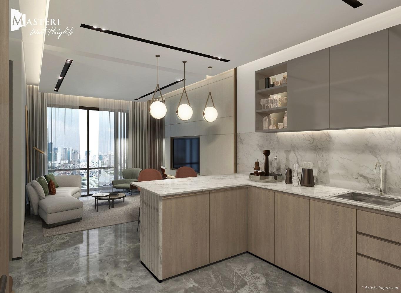 căn hộ tại Masteri West Heights, Tây Mỗ, Nam Từ Liêm, thành phố Hà Nội, sở hữu thiết kế hiện đại với 1 phòng ngủ + 1 phòng vệ sinh + bếp, DT 48 mét vuông.
