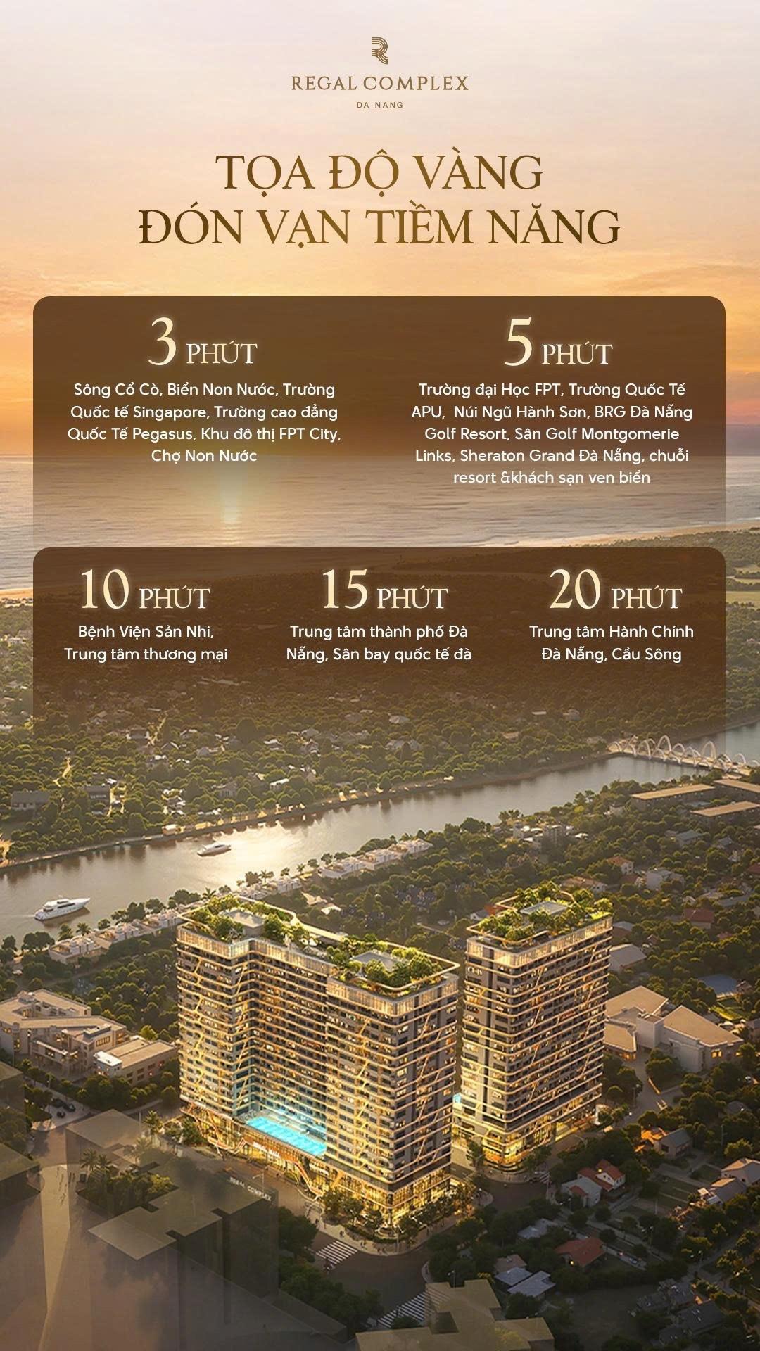 Regal Complex là biểu tượng sống mới tại trung tâm Đà Nẵng, nơi hội tụ tinh hoa kiến trúc, thương mại và phong cách sống thượng lưu. Dự án sở hữu vị trí chiến lược, kết nối nhanh sân bay – biển – trung tâm tài chính, đón đầu hạ tầng Metro, Light Rail trong tương lai.