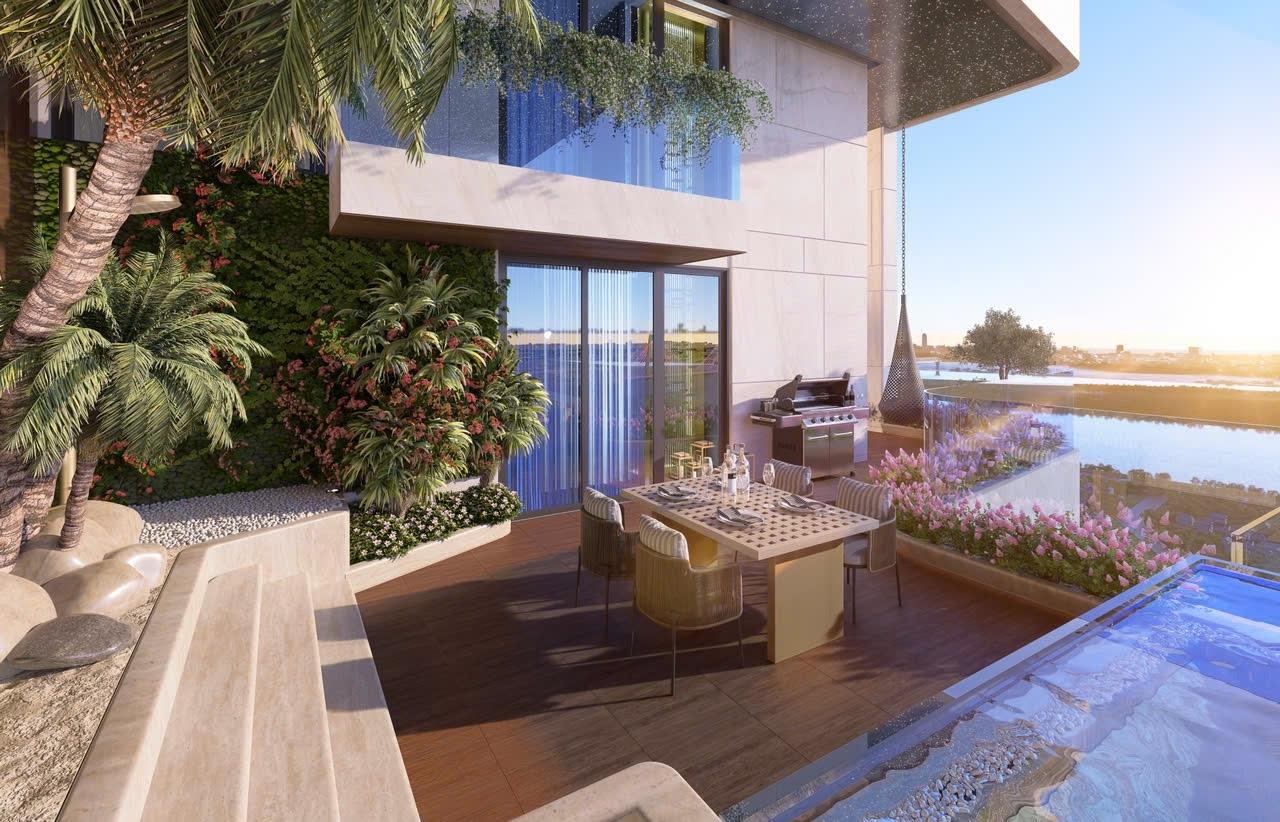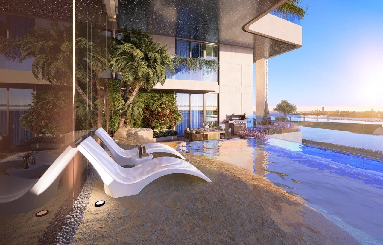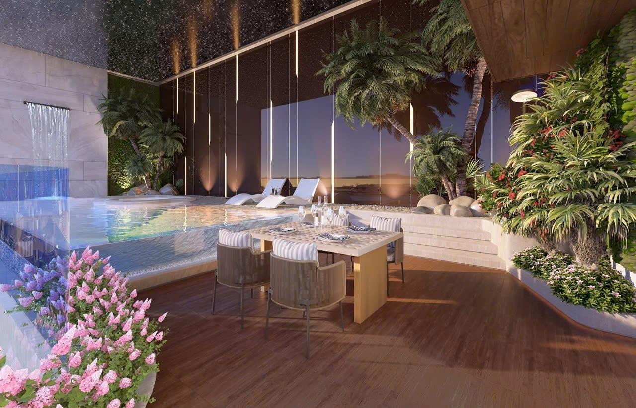 - Điểm nhấn đặc biệt: Sân vườn riêng rộng 72.1 mét vuông tích hợp bể bơi vô cực ngay tại tầng 1.