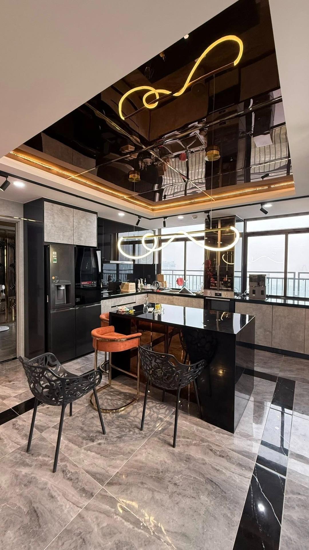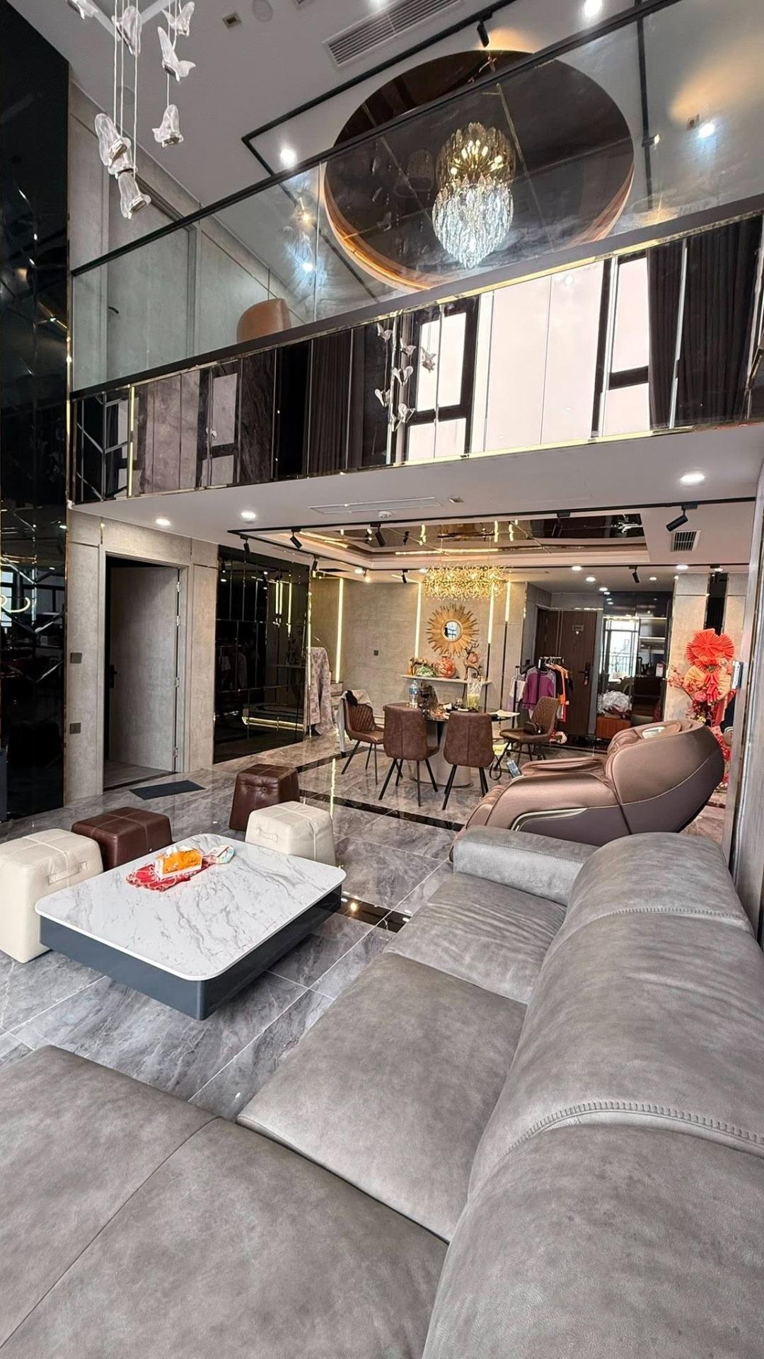 • Không gian: Phòng khách trần cao, hệ kính lớn sát sàn tạo cảm giác như "