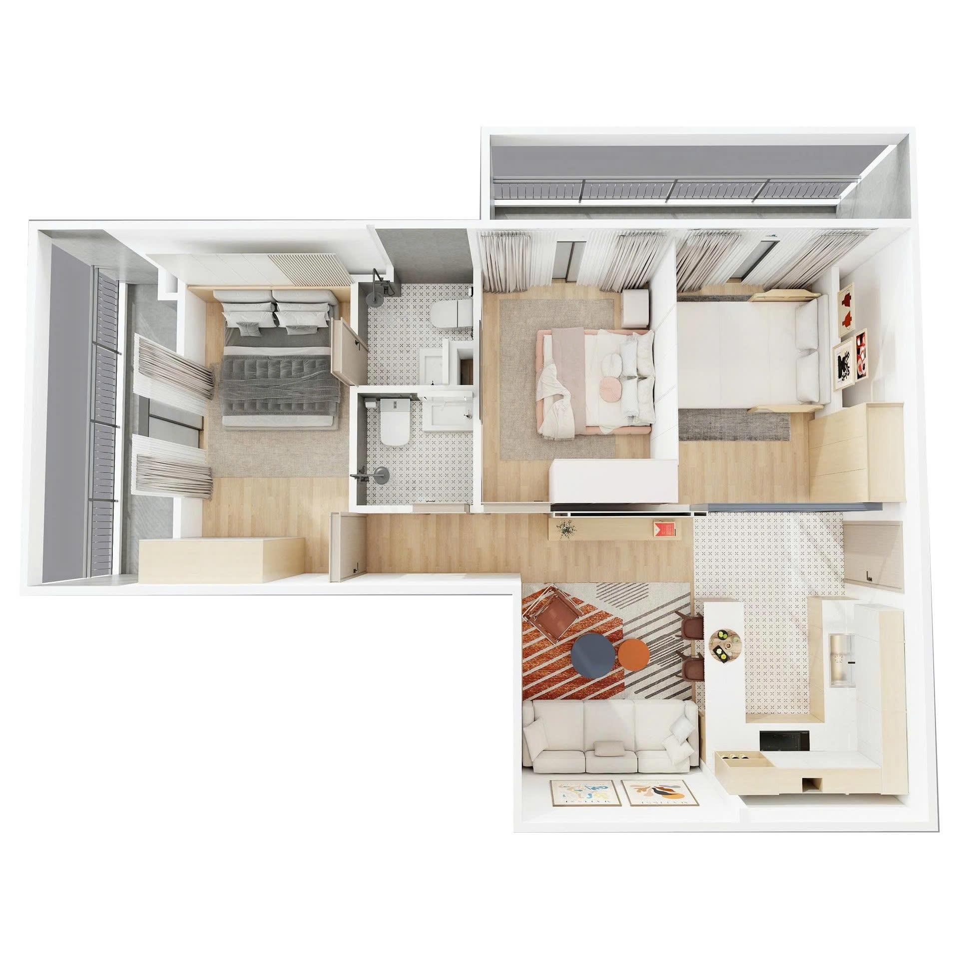 DT tối ưu 70 mét vuông : Phù hợp cho gia đình trẻ hoặc gia đình 2–3 thế hệ. Thiết kế thông minh: Phòng khách thoáng, bếp