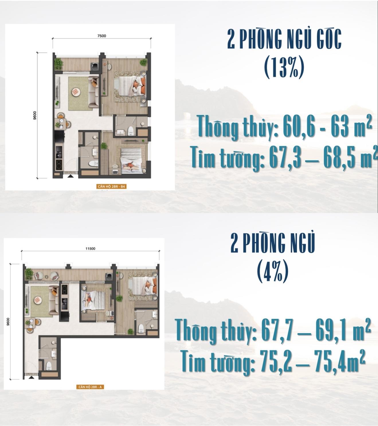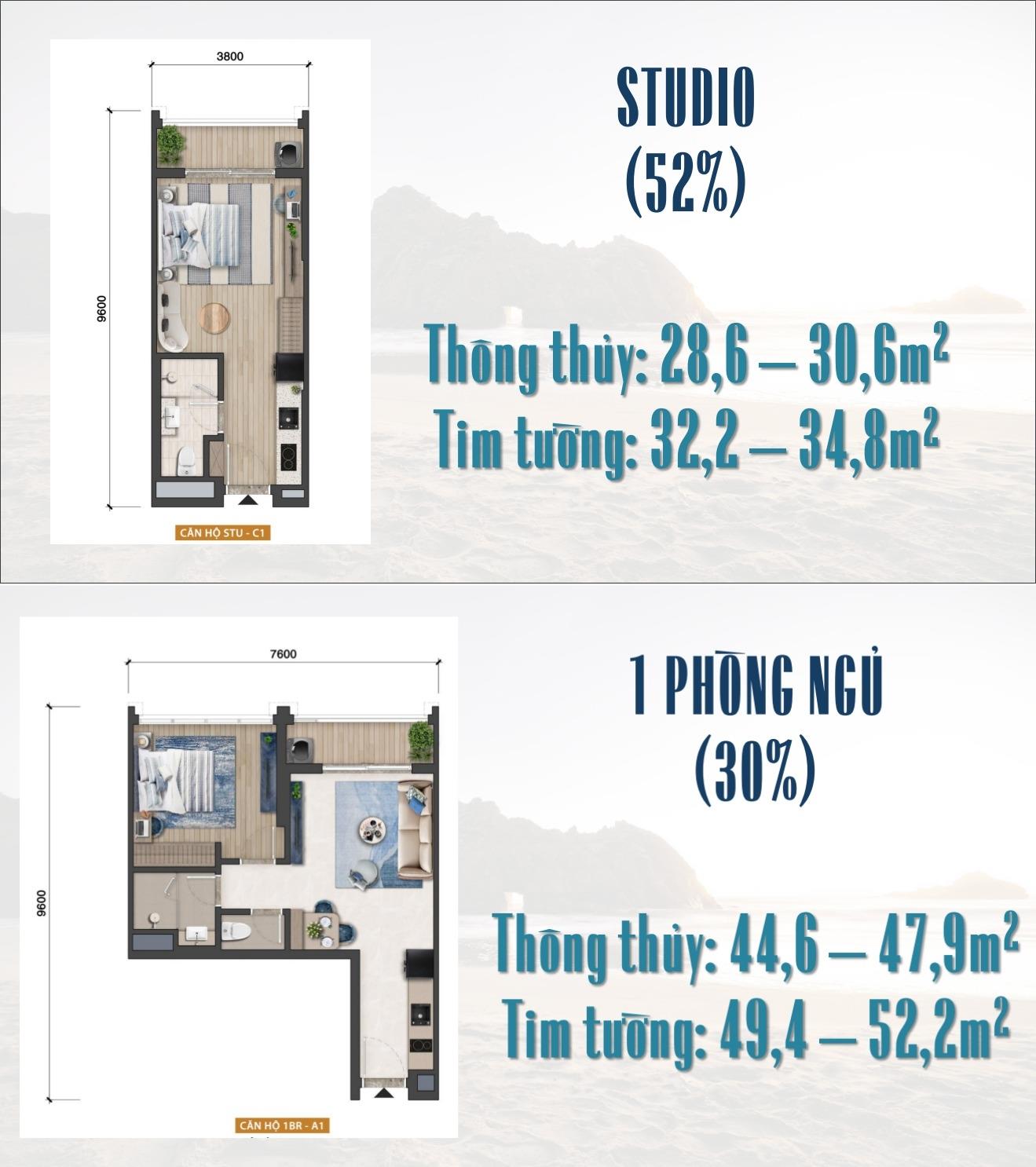 Studio: 31m2 | 1 phòng ngủ: 45-47m2 | 2 phòng ngủ: 61-68m2