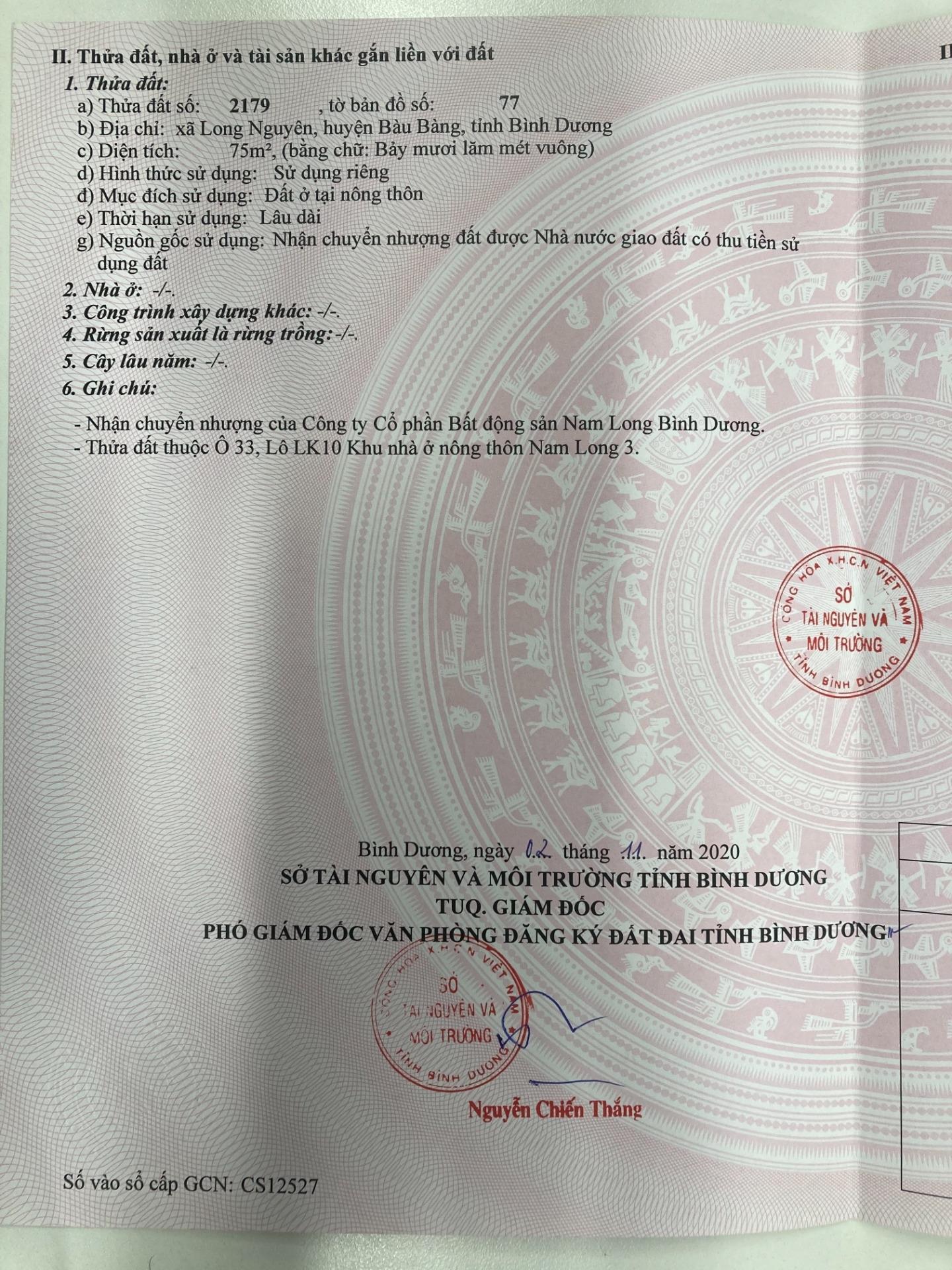 Tôi chính chủ thửa đất số 2179, tờ bản đồ số 77, (ô 33 lô LK10) Khu nhà ở nông thôn Nam Long 3, xã Long Nguyên, huyện Bàu Bàng, tỉnh Bình Dương,