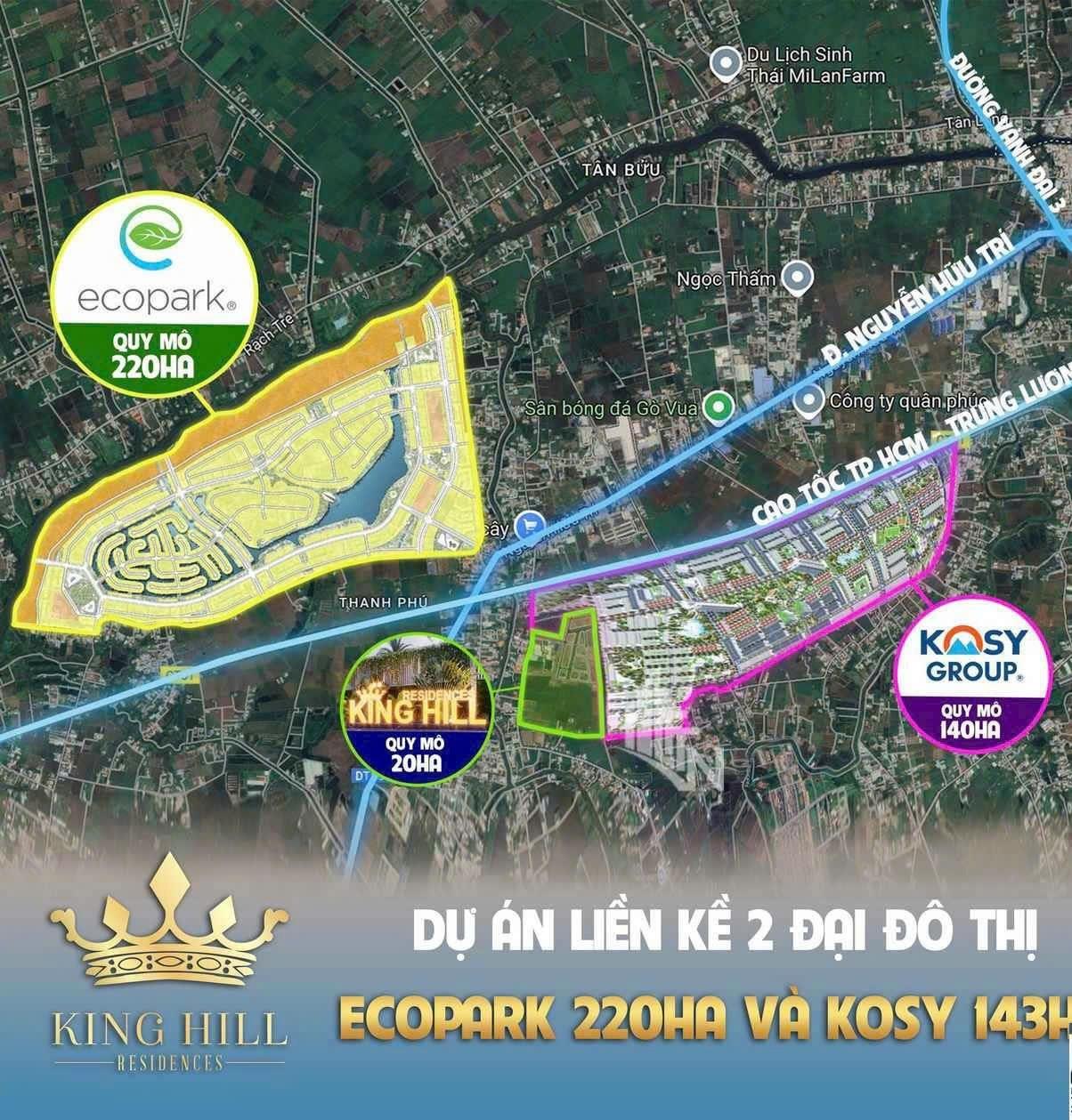 =King Hill Residences là KĐT kiểu mẫu quy mô 20ha, tọa lạc tại MT đường Nguyễn Hữu Trí, xã Thanh Phú, huyện Bến Lức, Long An – liên kế HCM chỉ 5 kilomet, kết nối trực tiếp với cao tốc Trung Lương và các trục giao thông huyết mạch như QL 1A, DT824, DT835B, DT826, và cao tốc Bến Lức – Long Thành