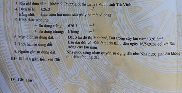DT 626,3tổng: m2 - Thổ cư: 300