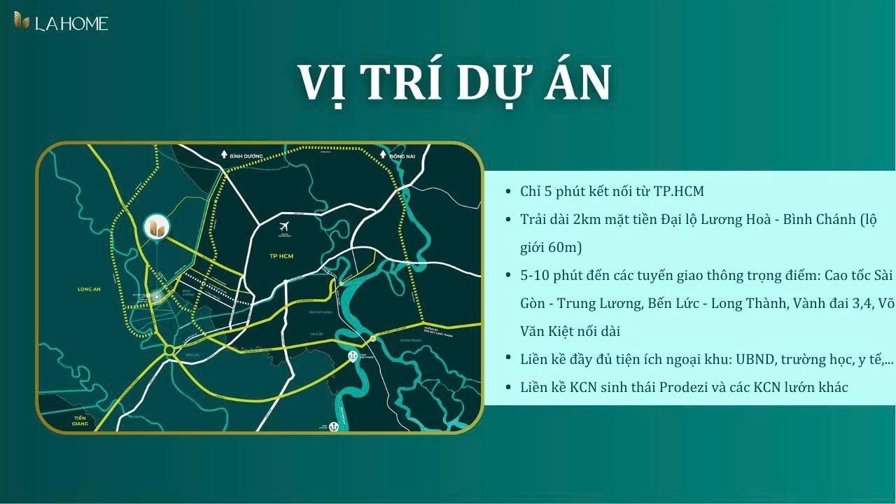 • 5 ph kết nối Tp Tp HCM qua MT Lương Hòa – Bình Chánh, tuyến đường huyết mạch kết nối trực tiếp cao tốc Hồ Chí Minh – Trung Lương, vành đai 3 – 4, Bến Lức – Long Thành, Võ Văn Kiệt kéo dài.