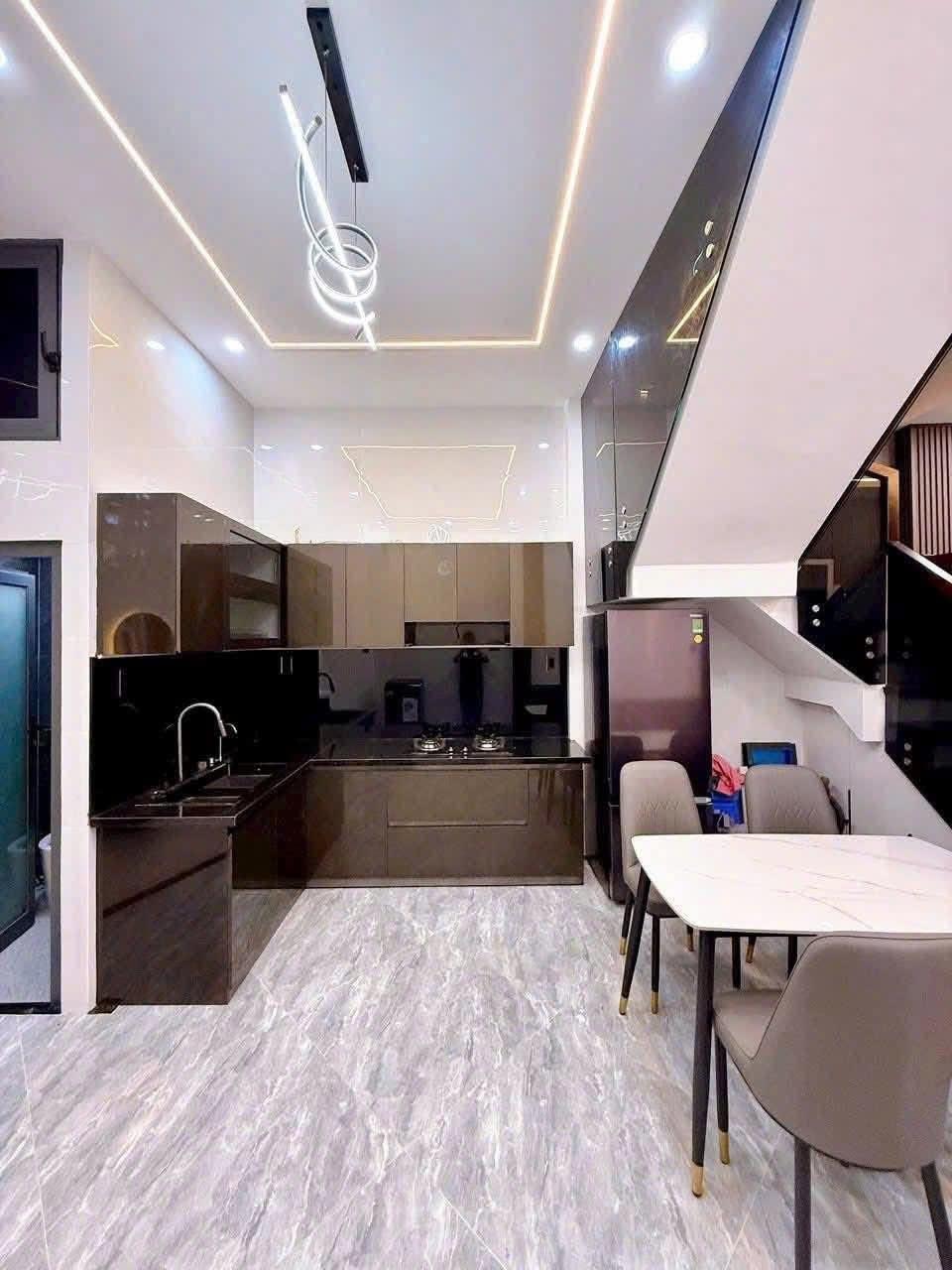 • Bếp trang bị sẵn kệ bếp, tủ gỗ phủ laminate chống ẩm, mặt đá trắng tinh tế