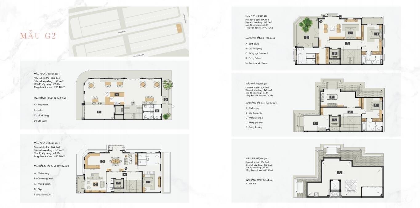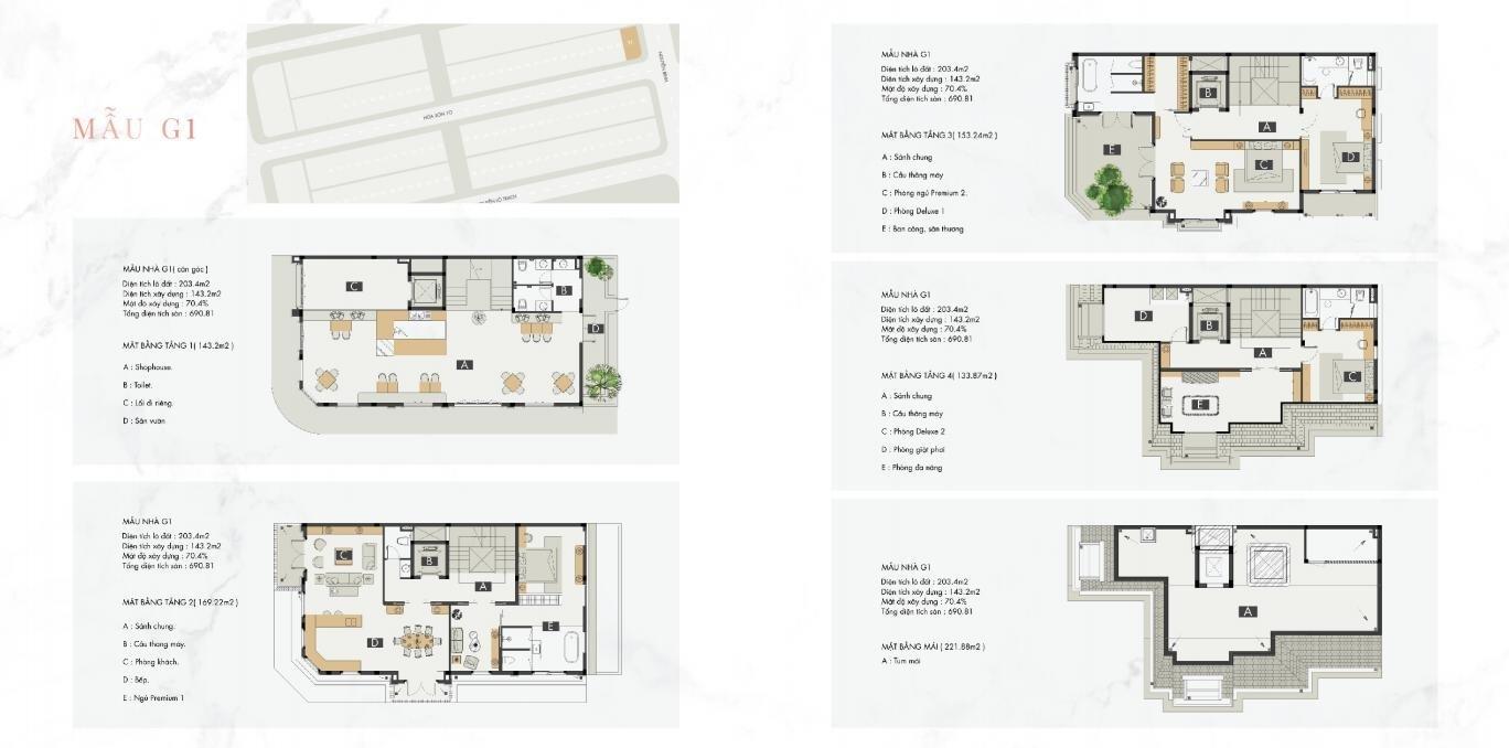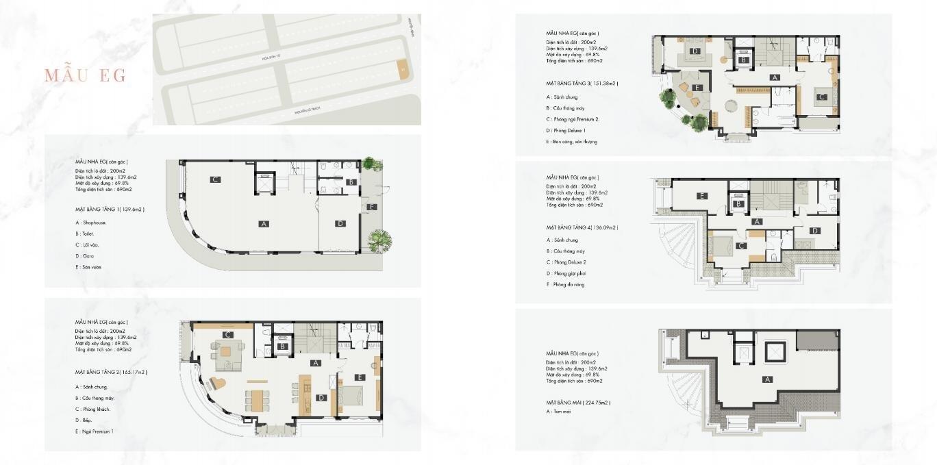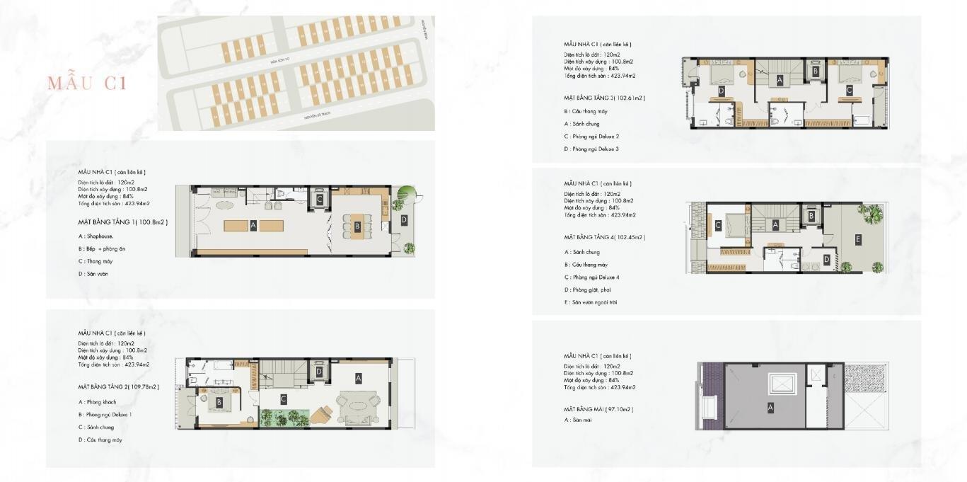 DT điển hình: khoảng120 m2 (6×20) với 4 tầng + mái.