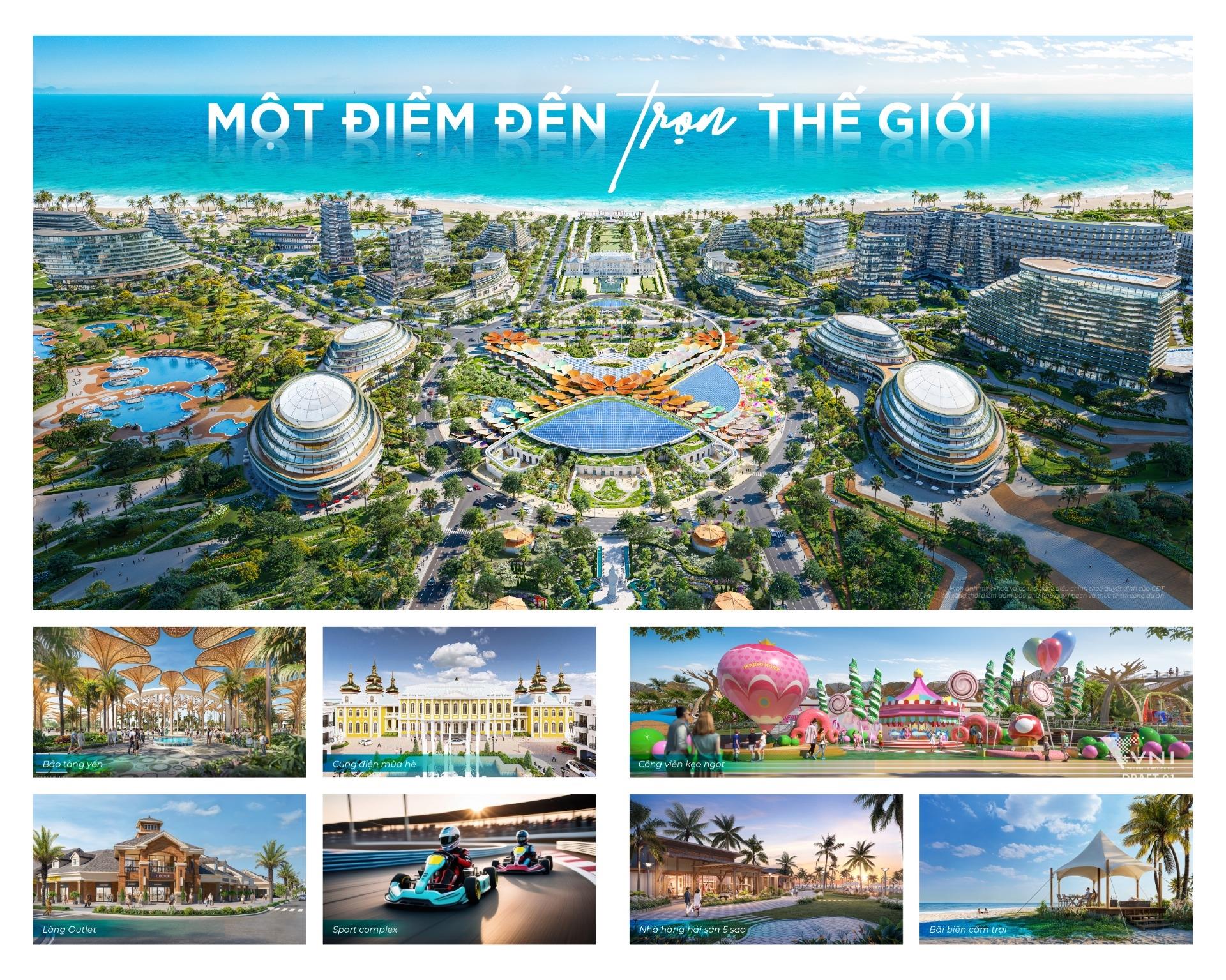 * Ngoài ra còn sở hữu 38 đại tiện ích Du Lịch - Nghỉ dưỡng - Vui chơi giải trí - An cư hàng đầu như: Viện dưỡng lão 2,5ha; Casino Las Vegas 16,2ha; Sân KN Golf Link 90ha - 27 hố; Học viện hotel 5,72ha; Sport Complex 11,1ha; Làng outlet 3,3ha; Bảo tàng yến 2,2ha; Nhà ánh sáng; Cung điện mùa hè; CLB cưỡi ngựa; Phố đi bộ chân mây; Thiên đường hải sản; Học viện hotel; Phố ẩm thực; Siêu thị - Nhà hàng, BV và trường cấp 1,2,3.;...