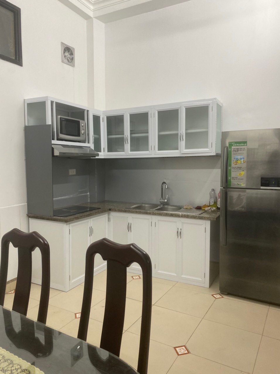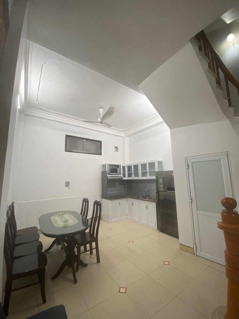 + Tầng 1 là không gian để xe và bếp, có bàn ăn, tủ lạnh, tủ bếp.
