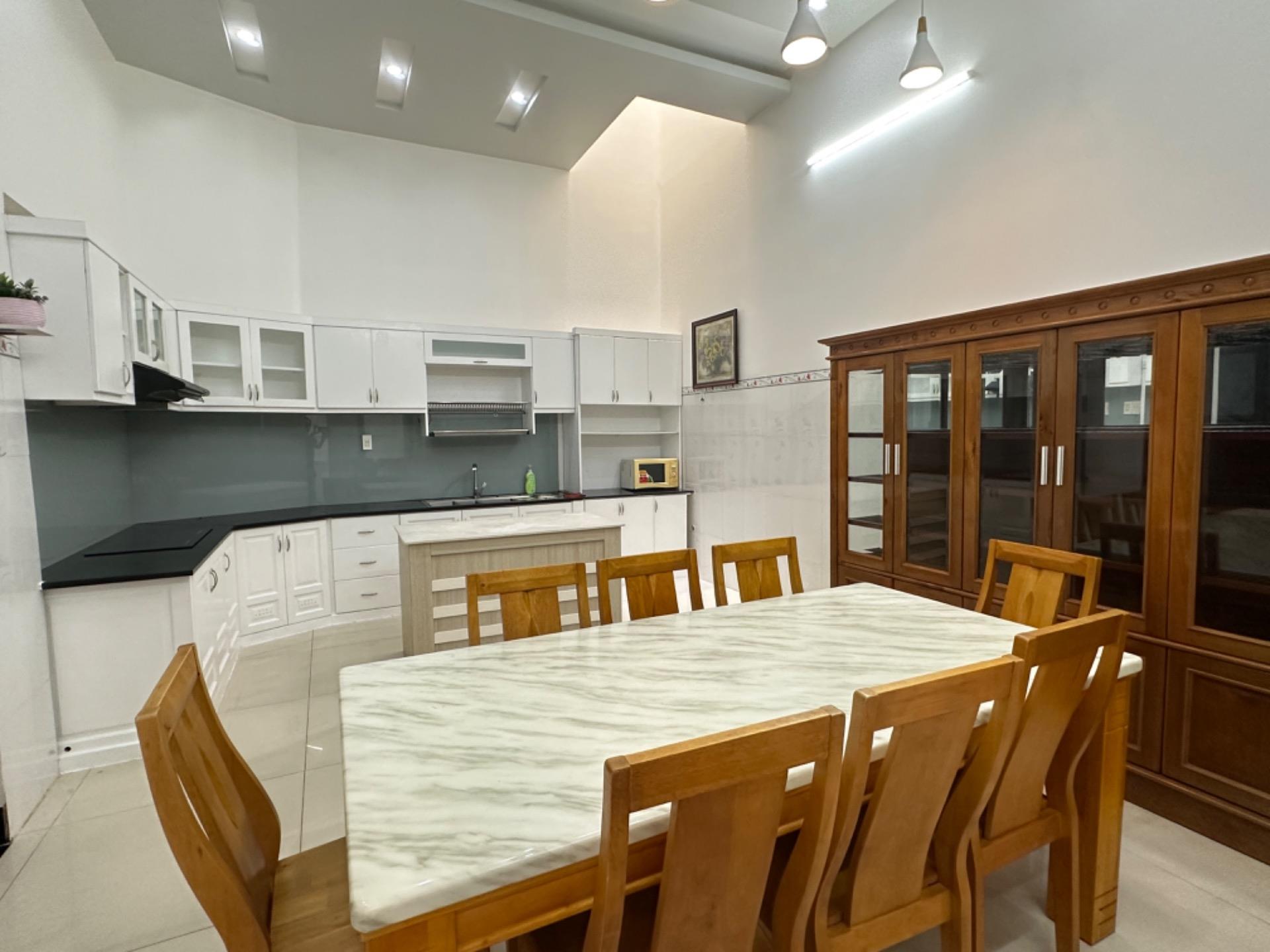 -gian bếp rộng đầy đủ trang thiết bị: lò viba, tủ lạnh, bàn ăn bàn soạn.....v..v...
