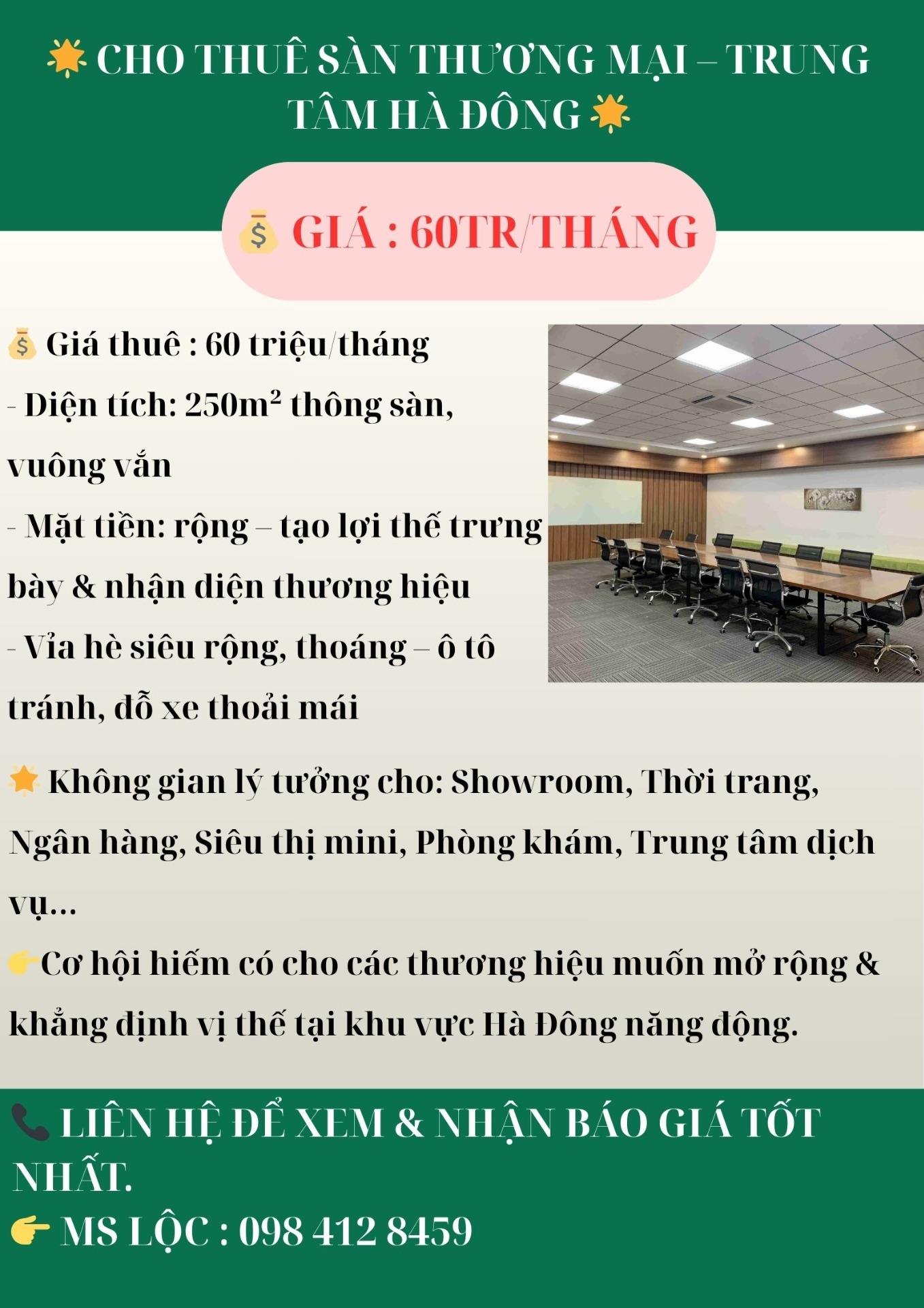 💰 - - - Vỉa hè siêu rộng, thoáng – 🌟 Không gian lý tưởng cho: Showroom, Thời trang, 👉Cơ hội hiếm có cho các thương hiệu muốn mở rộng & khẳng định vị thế tại khu vực Hà Đông năng động. 📞 🌟 CHO THUÊ SÀN THƯƠNG MẠI – TRUNG TÂM HÀ ĐÔNG 🌟
